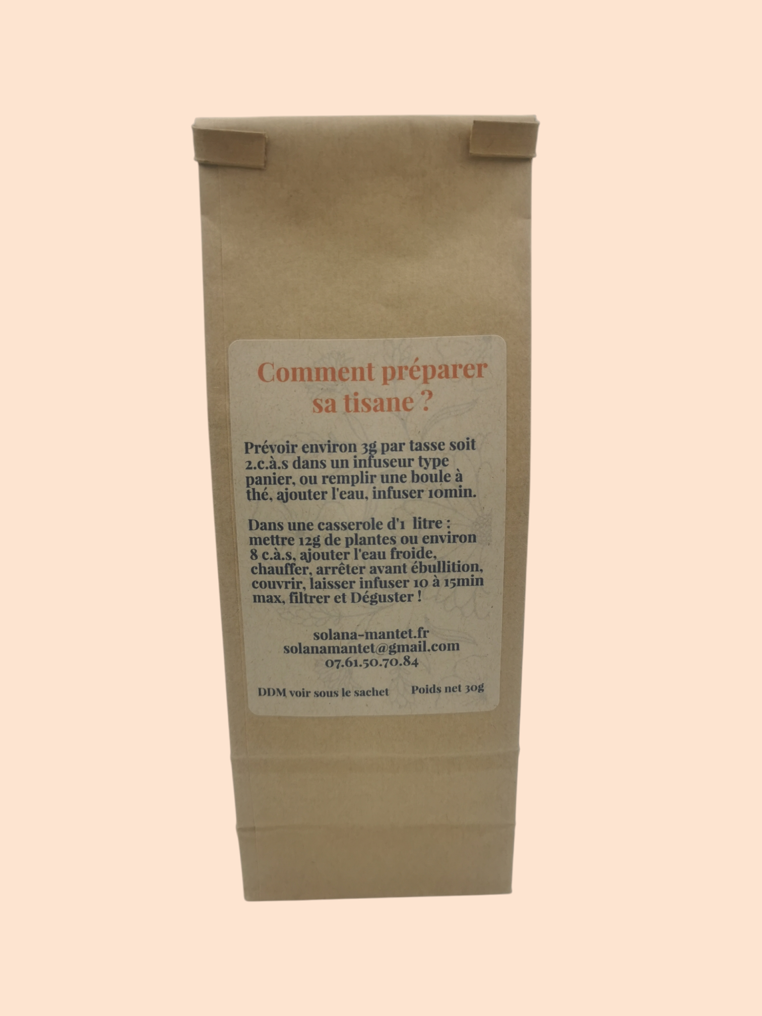 Dans une casserole d’1 litre : mettre 12 g de plantes (environ 8 c. à s), ajouter l’eau froide, chauffer, arrêter avant ébullition, couvrir, laisser infuser 10 à 15 minutes max. Filtrer et déguster bien chaud ou tiède.